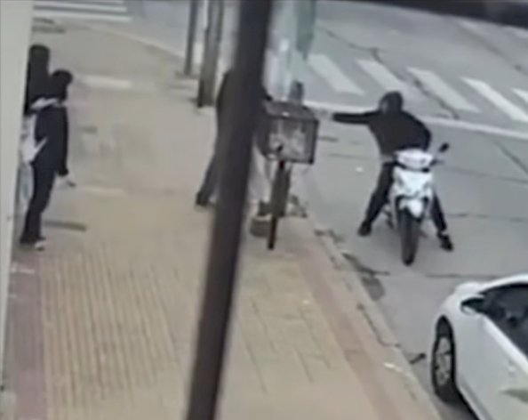 Tal como se ve en las cámaras de seguridad que registraron la secuencia, un motochorro los interceptó en calle 116 y 530 cerca de las 13.40 hs y sin bajarse de su vehículo comenzó a amedrentar a los jóvenes que caminaban por la vereda.